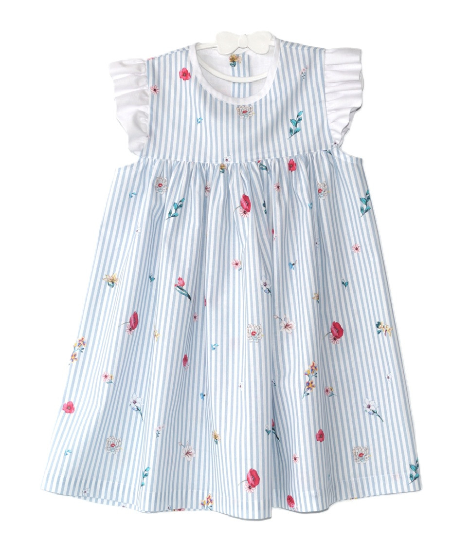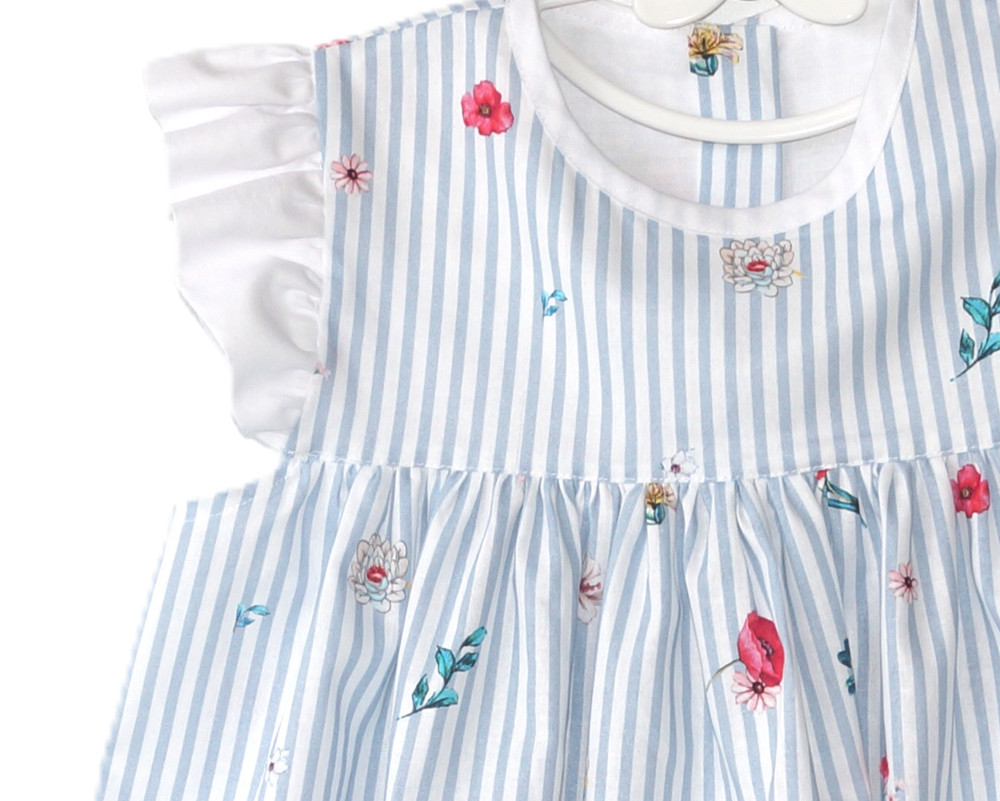 Let og charmerende kjole med blå og hvide striber samt små, farvestrålende blomster. De fine vingeærmer og knapper i ryggen giver et tidløst og behageligt design – ideel til både hverdagsbrug og festlige anledninger.