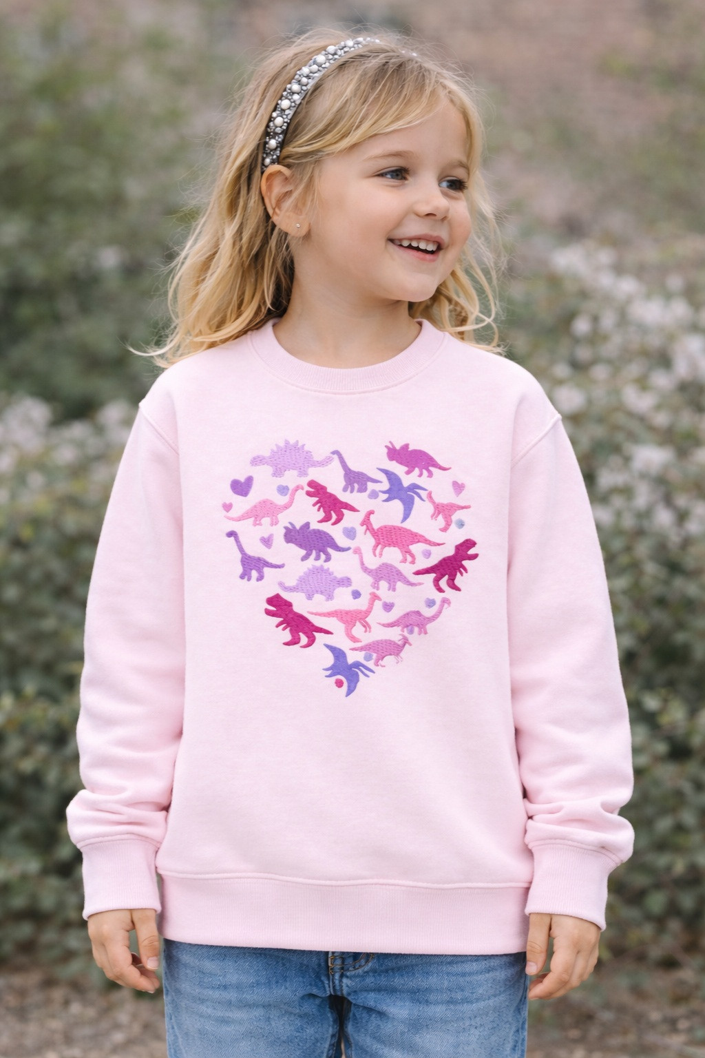 En stilfuld og behagelig børnesweatshirt med et livligt, hjerteformet broderi af flerfarvede dinosaurer.