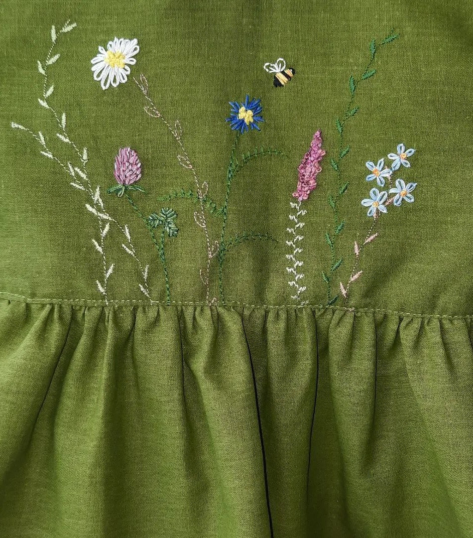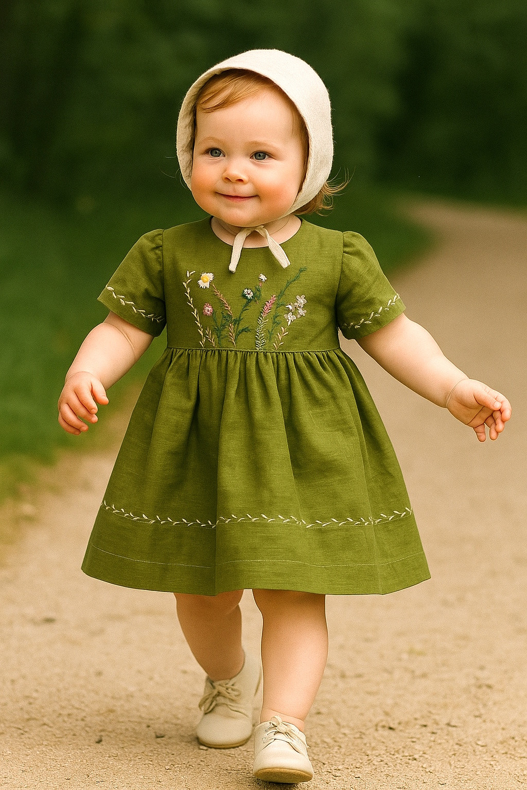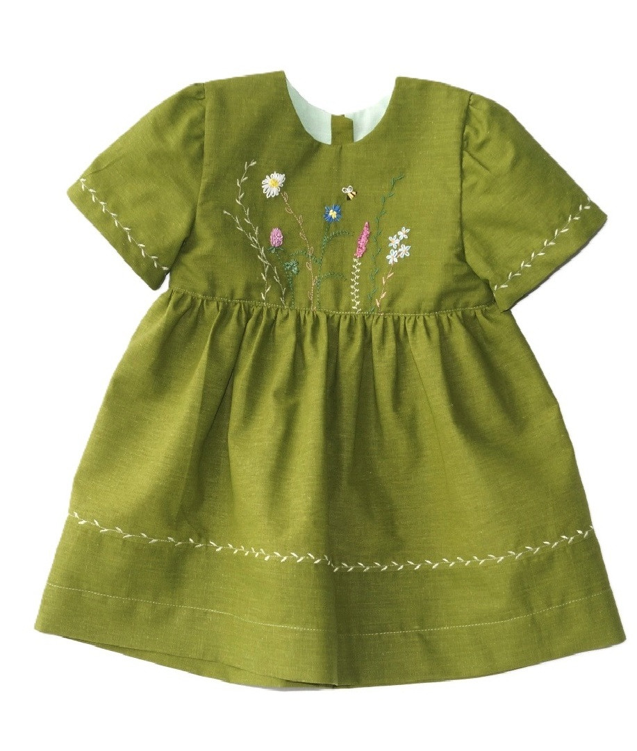 En skøn sommerkjole i en frisk, grøn nuance, dekoreret med fint broderi af vilde blomster og en lille bi. Fremstillet i 100% bomuld for maksimal komfort og åndbarhed – ideel til varme dage fyldt med leg og oplevelser.